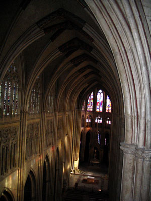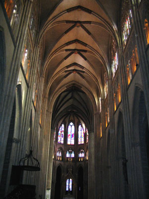NEF CENTRALE Construite au XIVème siècle, elle est haute de 26 m 50 et comprend sept travées de trois étages. Au-dessus des arcs en ogive, qui séparent la nef des bas-côtés, court une galerie qui fait le tour de l'édifice : le triforium.Sous les voûtes, des vitraux de la Renaissance, restaurés à la fin du XIXème siècle, conservent quelques belles couleurs. Les sujets sont empruntés à la Genèse (Adam et Eve) et à l'Evangile (scènes de l'enfance de Jésus et de la Passion). La chaire (plan n°20), en acajou des îles Canaries, avec ses belles sculptures, date de 1760. Aux clefs de voûte on reconnaît les armes d'Angleterre (trois léopards), de France (fleurs de Lys) et celles du cardinal bayonnais Godin, bienfaiteur de la Cathédrale et en particulier, dans le transept sud, la nef bayonnaise. Les orgues sont de 1865 : la tribune et le buffet datent de 1705.